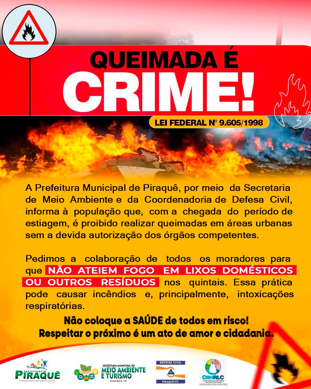 A prática de queimadas urbanas, além de ilegal, coloca em risco a saúde da população e o meio ambiente. Com a chegada do período de estiagem, reforçamos o alerta: não ateie fogo em lixos domésticos ou resíduos nos quintais!