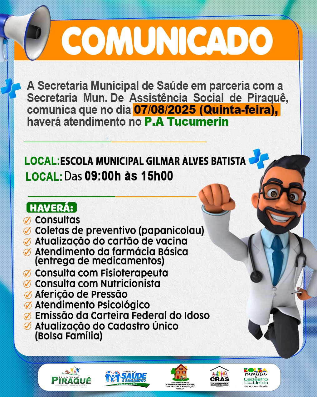 A Prefeitura de Piraquê, por meio da Secretaria Municipal de Saúde e da Secretaria de Assistência Social, informa que nesta quinta-feira, dia 07/08/2025, haverá atendimento no P.A. Tucumerin, das 09h às 15h, na Escola Municipal Gilmar Alves Batista.