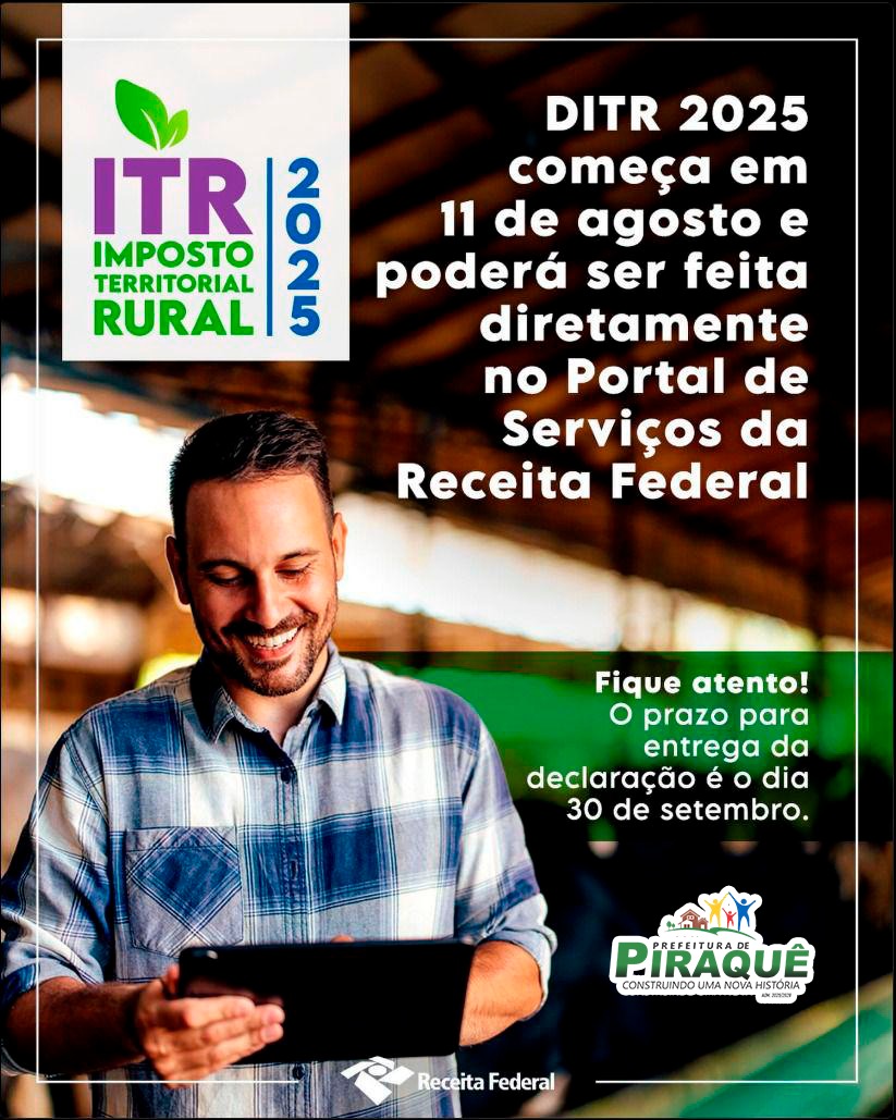 A Declaração do Imposto sobre a Propriedade Territorial Rural (DITR 2025) começa no dia 11 de agosto e poderá ser feita diretamente no Portal de Serviços da Receita Federal.