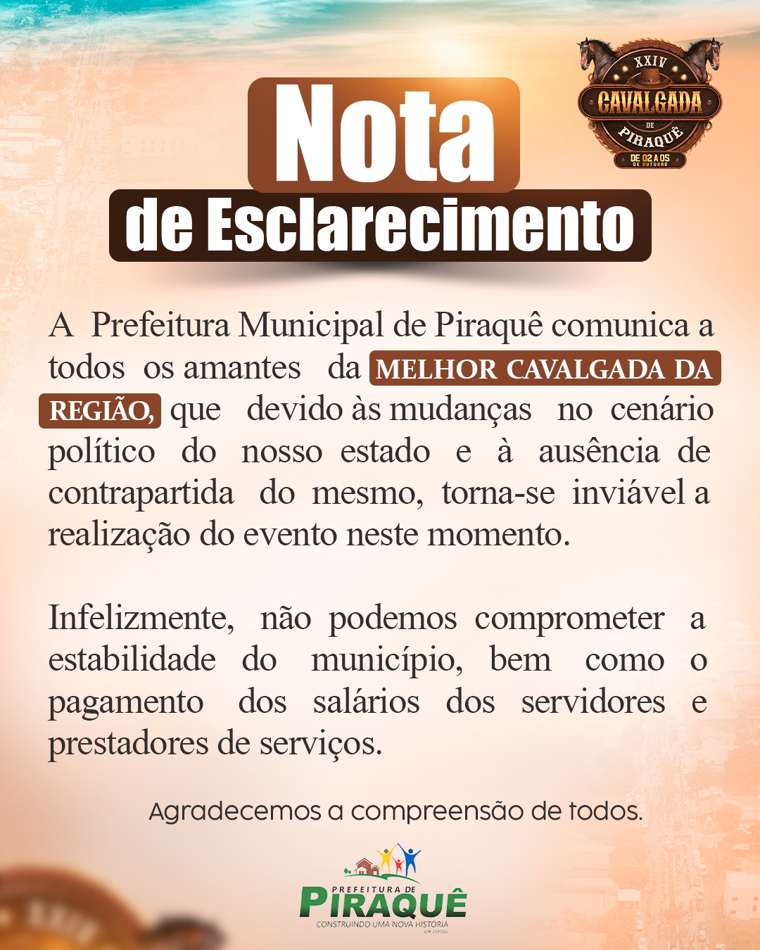 A Prefeitura Municipal de Piraquê comunica a todos os amantes da