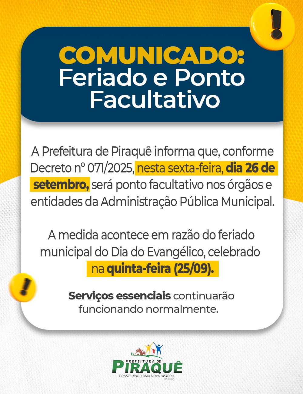 A Prefeitura de Piraquê informa que, conforme Decreto nº 071/2025, nesta sexta-feira, dia 26 de setembro, será ponto facultativo nos órgãos e entidades da Administração Pública Municipal.