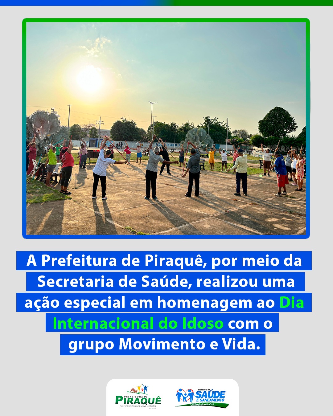 Na manhã de 30 de setembro, a Prefeitura de Piraquê realizou uma ação especial em alusão ao Dia Internacional do Idoso (01 de outubro), na Praça Municipal, junto ao grupo do projeto Movimento e Vida – Ginástica Laboral para Idosos.