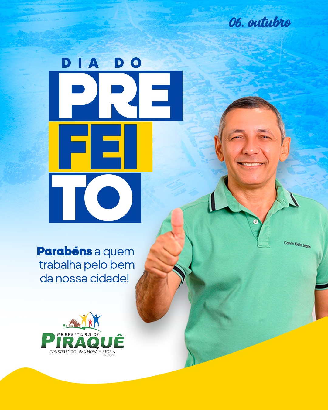 Neste Dia do Prefeito, a Prefeitura de Piraquê parabeniza e homenageia todos os gestores municipais que, com compromisso, coragem e dedicação, trabalham diariamente em prol do desenvolvimento das cidades e do bem-estar da população.