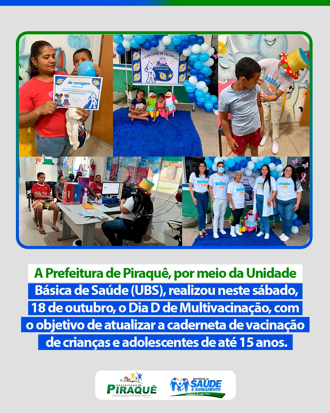A Prefeitura de Piraquê, por meio da Unidade Básica de Saúde (UBS), realizou neste sábado, 18 de outubro, o Dia D de Multivacinação, com o objetivo de atualizar a caderneta de vacinação de crianças e adolescentes de até 15 anos.