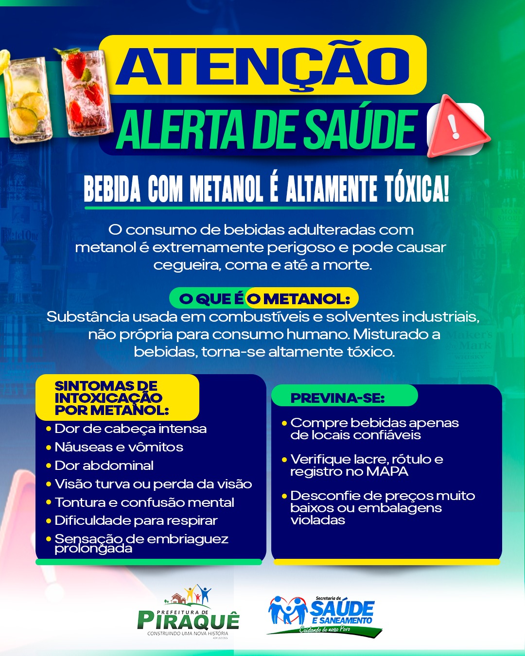 Atenção: o consumo de bebidas adulteradas com metanol é extremamente perigoso e pode causar cegueira, coma e até a morte.