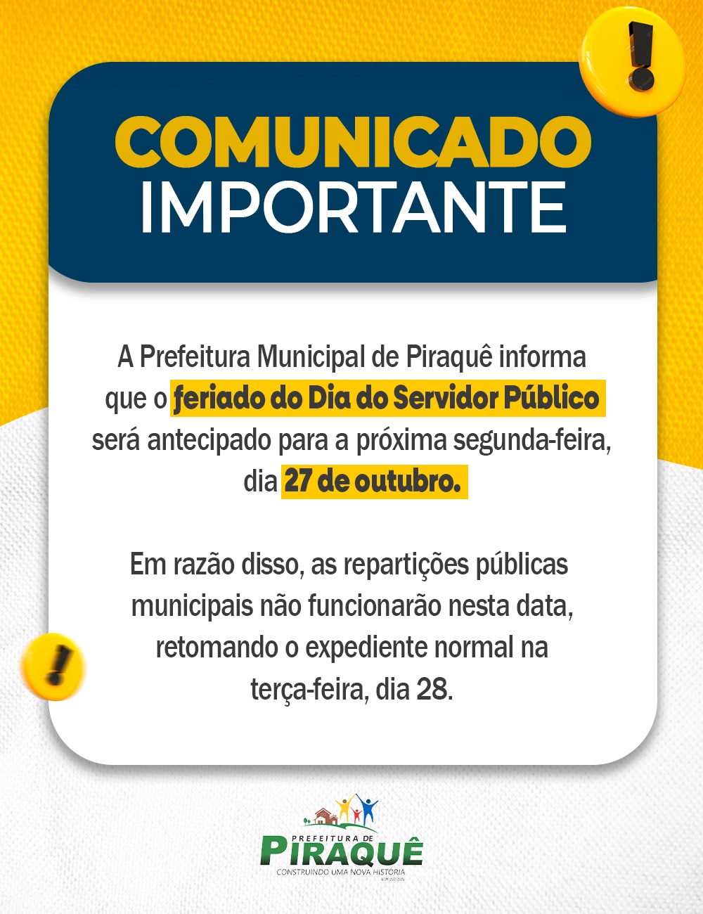 A Prefeitura Municipal de Piraquê informa que o feriado do Dia do Servidor Público será antecipado para a próxima segunda-feira, dia 27 de outubro.