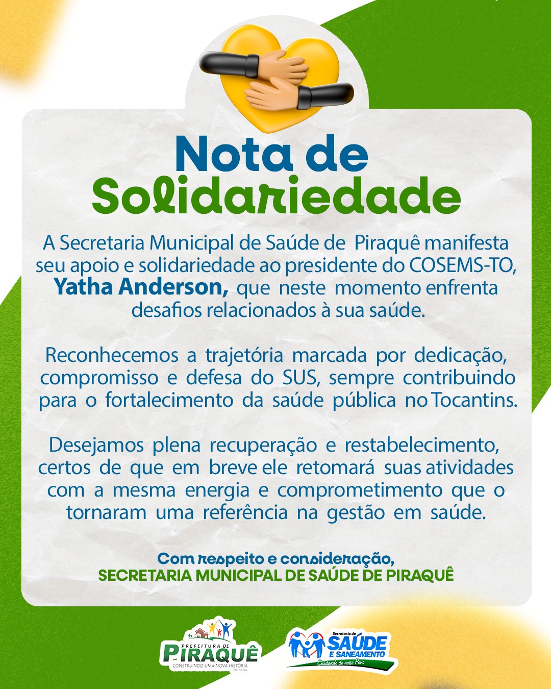 A Secretaria Municipal de Saúde de Piraquê manifesta seu apoio e solidariedade ao presidente do COSEMS-TO, Yatha Anderson, que neste momento enfrenta desafios relacionados à sua saúde.
