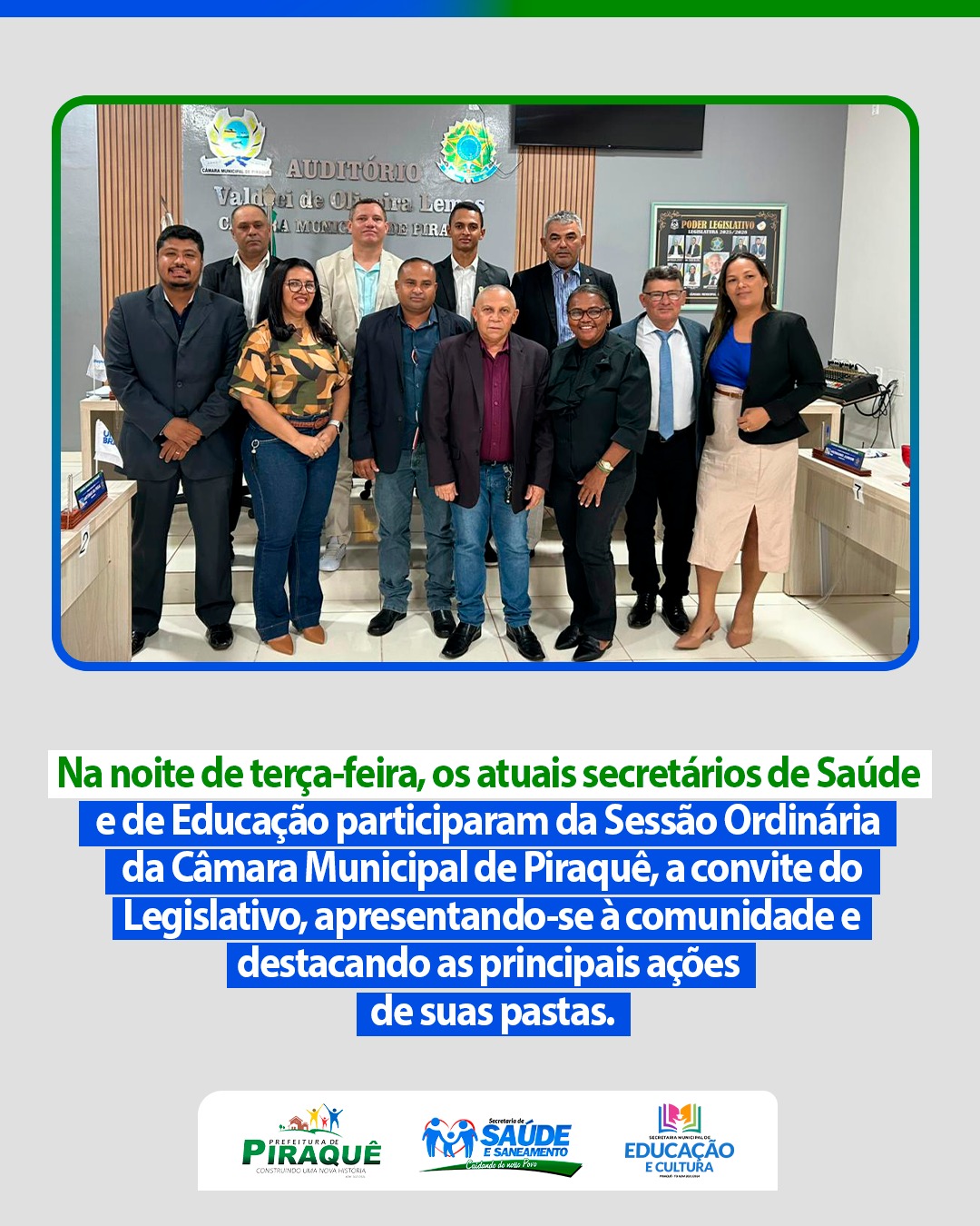 Na noite de terça-feira (04), os secretários municipais de Saúde, Ronisvaldo da Silva e secretária de Educação, Vanusa Figueiredo, participaram da Sessão Ordinária da Câmara Municipal de Piraquê, a convite do Legislativo.