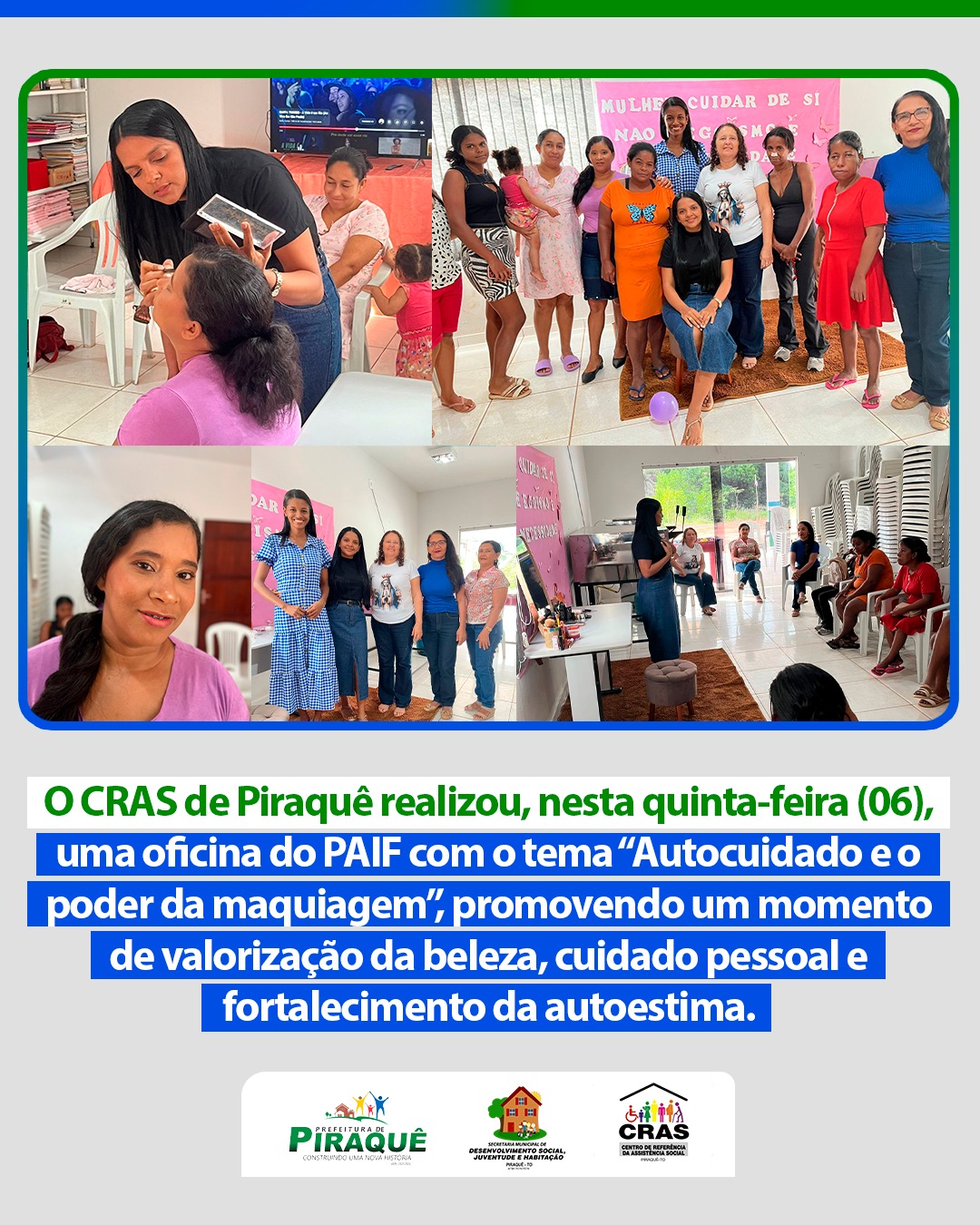Nesta quinta-feira (06), o CRAS de Piraquê promoveu uma oficina do PAIF com o tema “Autocuidado e o poder da maquiagem”, conduzida pela palestrante Thais Brito.