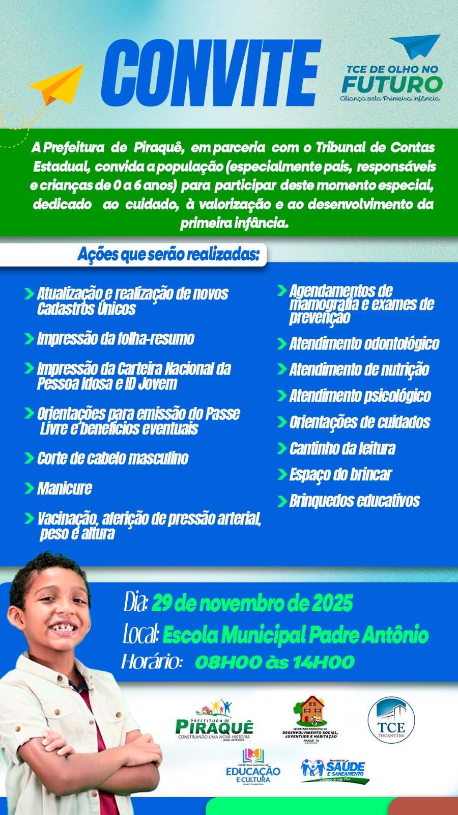 A Prefeitura de Piraquê, em parceria com o Tribunal de Contas Estadual, convida a população (especialmente pais, responsáveis e crianças de 0 a 6 anos) para participar deste momento especial, dedicado ao cuidado, à valorização e ao desenvolvimento da primeira infância