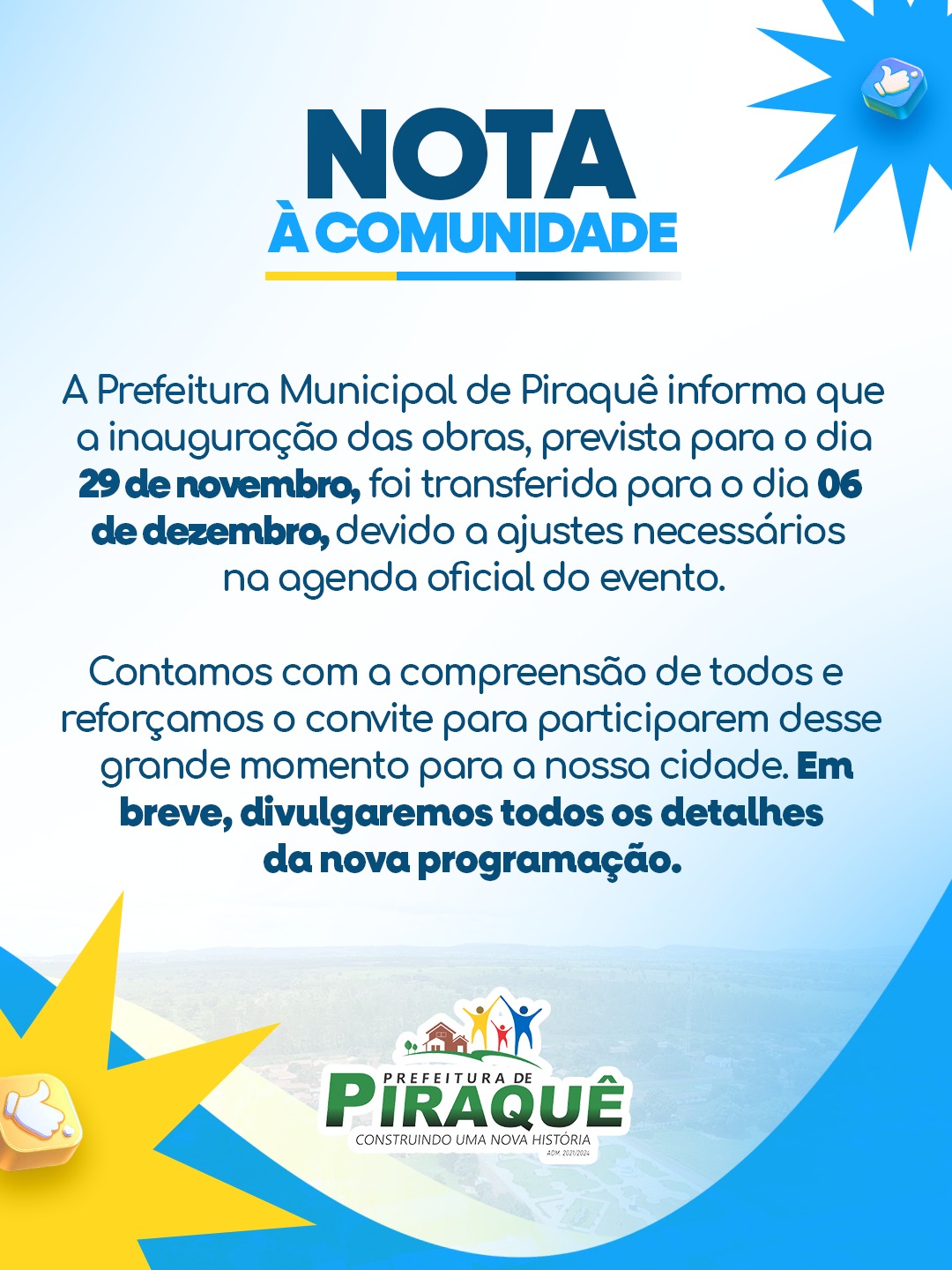 A Prefeitura Municipal de Piraquê informa que a inauguração das obras, prevista para o dia 29 de novembro, foi transferida para o dia 06 de dezembro, devido a ajustes necessários na agenda oficial do evento.