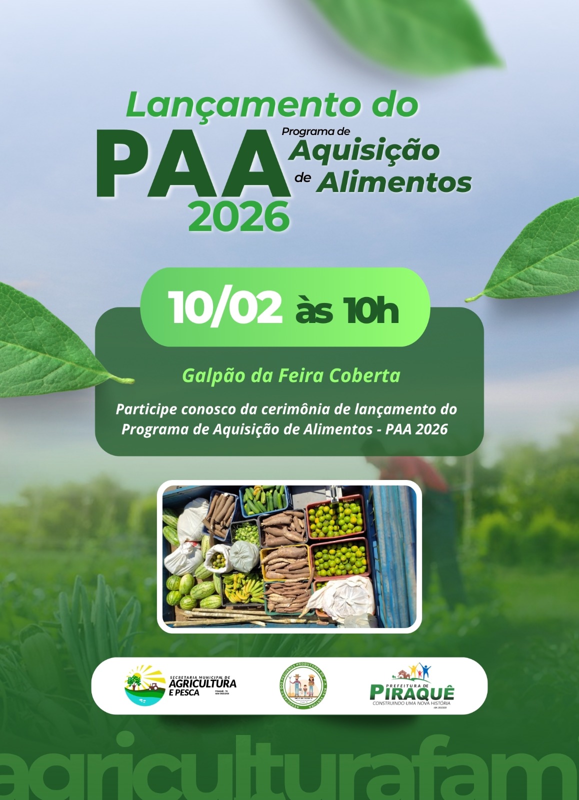 A Prefeitura de Piraquê, em parceria com a Associação dos Pequenos Produtores do P.A. Boa Ventura II, lança no dia 10/02/2026, às 10h, no Galpão da Feira Coberta, o Programa de Aquisição de Alimentos (PAA) 2026.