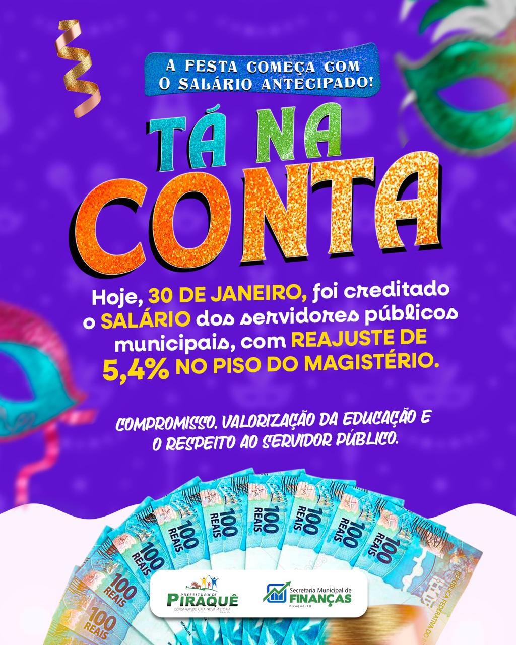 A Prefeitura de Piraquê realizou hoje o pagamento do salário dos servidores municipais, com reajuste de 5,4% no piso salarial do magistério, reforçando o compromisso com a valorização dos profissionais da educação e com a responsabilidade fiscal.