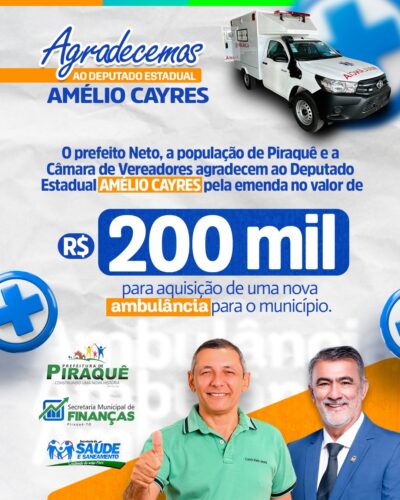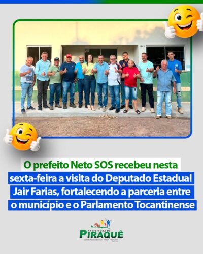O prefeito Neto SOS e a população de Piraquê, agradecem o Deputado Federal Vicentinho Junior, por destinar R$ 100.000,00 para a Saúde do município. Obrigado