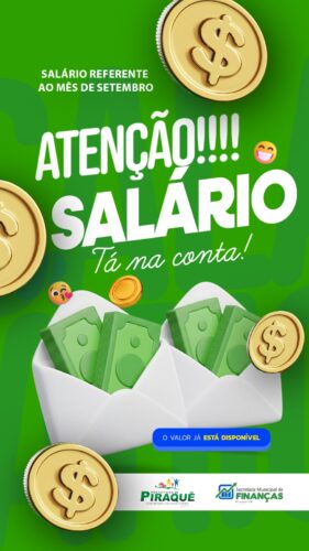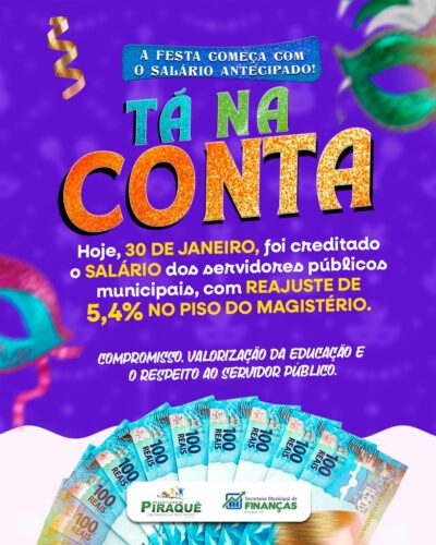 A Prefeitura de Piraquê realizou hoje o pagamento do salário dos servidores municipais, com reajuste de 5,4% no piso salarial do magistério, reforçando o compromisso
