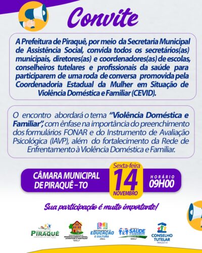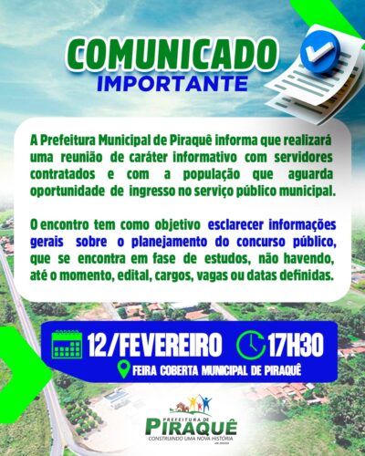A Prefeitura Municipal de Piraquê informa que realizará uma reunião de caráter informativo com servidores contratados e com a população que aguarda oportunidade de ingresso