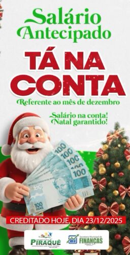 A Prefeitura de Piraquê antecipou para esta quinta-feira (22), o pagamento do salário referente ao mês de dezembro e o 13º para todos os servidores