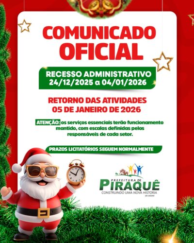 24.DEZ A 04.JANNATAL E ANO NOVO Não haverá expediente administrativo. Nesse período, permanecem mantidos os serviços essenciais, como saúde, limpeza pública, vigilância, abastecimento de água