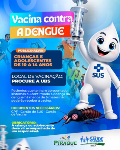 Crianças e adolescentes de 10 a 14 anosPelo SUSLocal de vacinação:Procure a UBS Atenção:Pacientes que apresentaram sintomas ou tiveram diagnóstico confirmado de dengue há menos