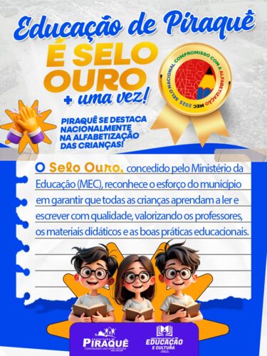 A Educação de Piraquê volta a ser reconhecida em nível nacional com a conquista do Selo Ouro da Alfabetização, concedido pelo Ministério da Educação (MEC).